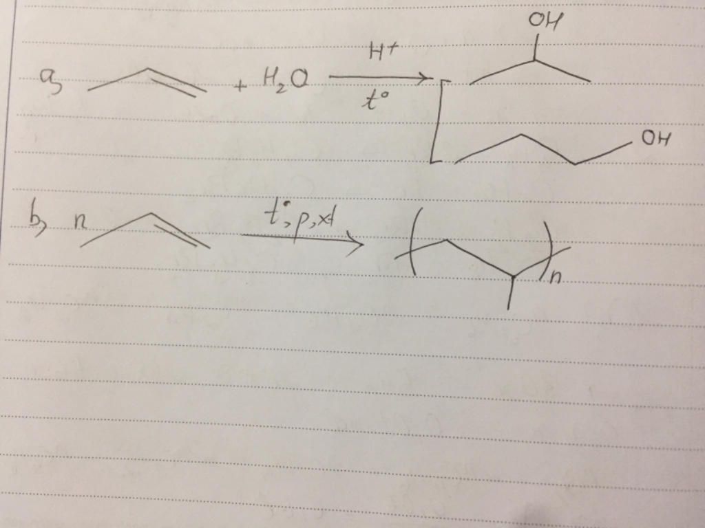 $CH_2=CHCH_3+H_2O\buildrel{{t^o, H^+}}\over\longrightarrow CH_3-CH_2-CH_2OH$