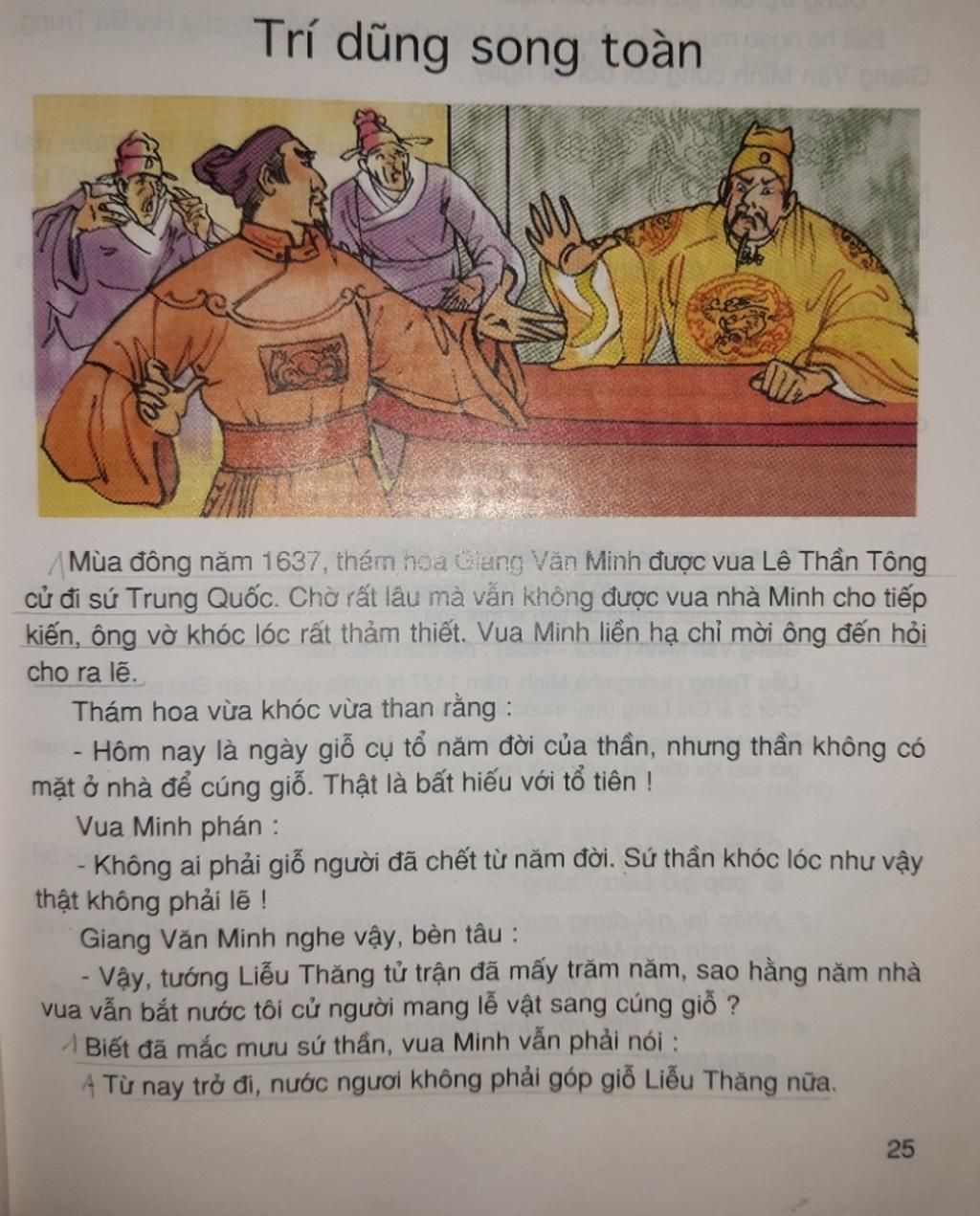 Vua Minh:"(cho mời Giang Văn Minh vào hỏi chuyện)Tại sao nhà ngươi lại khóc lóc như thế ?"