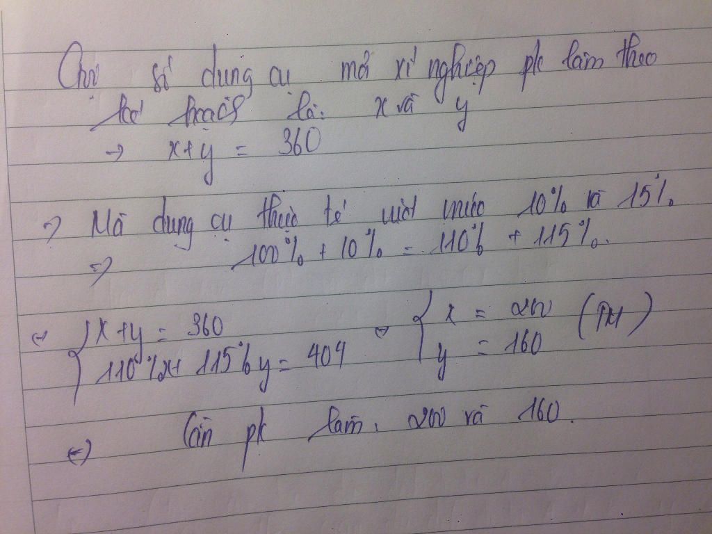 ⇒ {x=200(tm)y=160(tm){x+y=360110%x+115%y=404