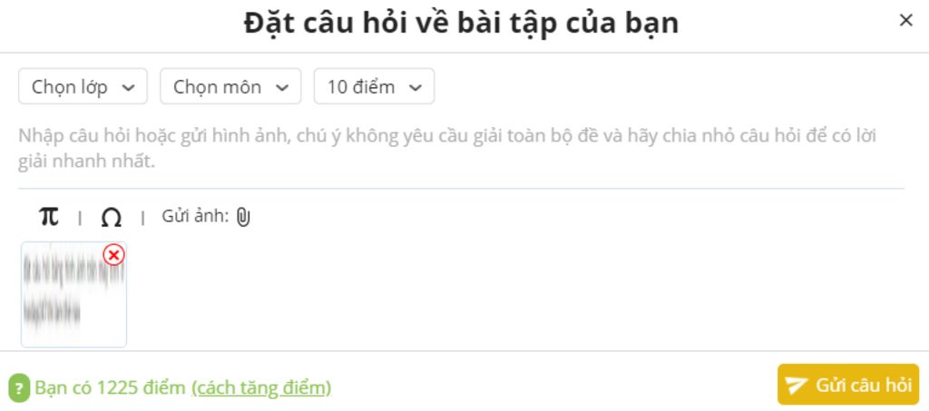Bước 3: Chọn file ảnh bài tập cần hỏi và ấn "Gửi câu hỏi" (Xem hình 1)