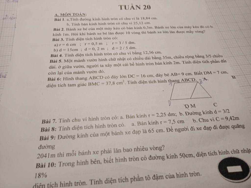 + Đường kính hình tròn có chu vi là $18,84$ cm:
