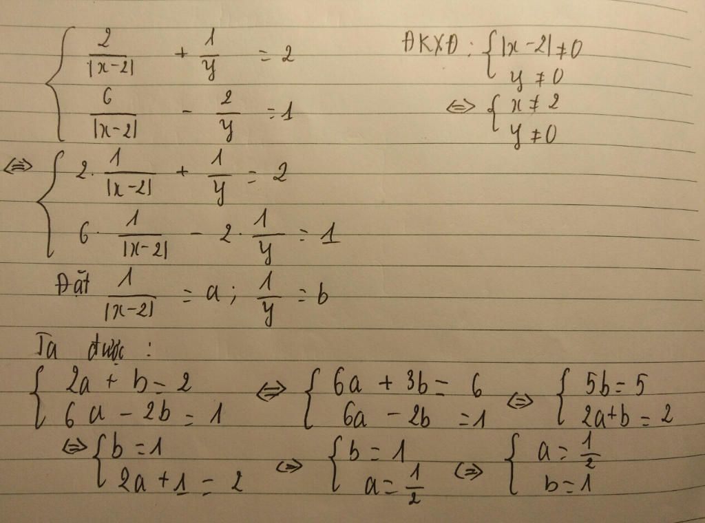 $\quad \begin{cases}\dfrac{2}{|x-2|}+\dfrac{1}{y}=2\\\dfrac{6}{|x-2|}-\dfrac{2}{y}=1\end{cases}$