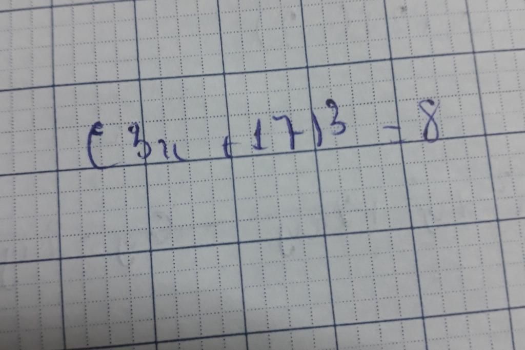 `(3x+17)^3=8``=>(3x+17)^3=2^3``=>3x+17=2` ( cùng rút gọn $2$ vế đi `^3` )`=>3x=2-17=(-15)``=>x=(-15)/3``=>x=(-5)`