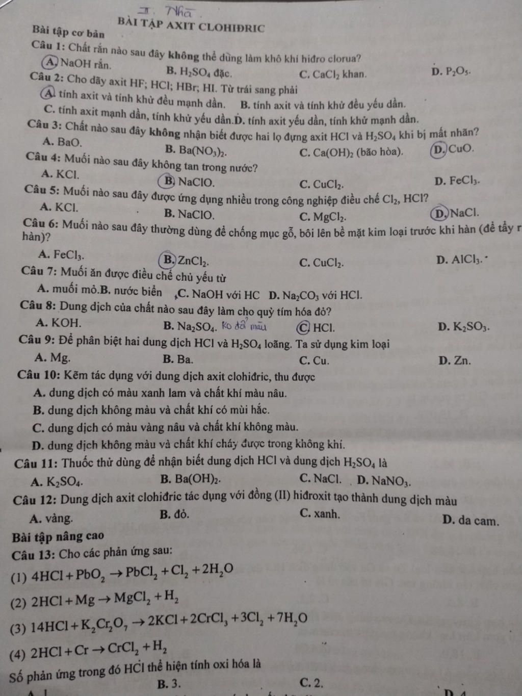Câu 1: Chất rắn nào sau đây không thể dùng làm khô khi hidro clorua?