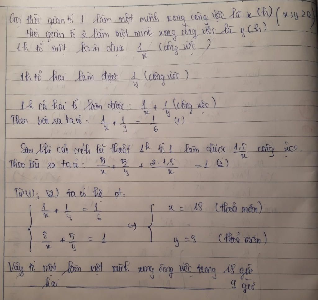 Gọi thời gian mỗi tổ một mình làm xong công việc lần lượt là $x(h)$ và $y(h)$