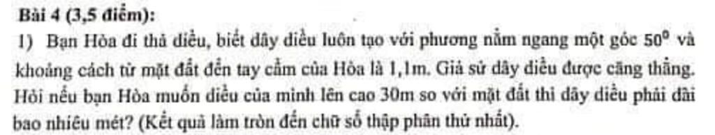 Vây nếu bạn Hòa muốn diều của mình lên cao 30m so với mặt đất thì dây diều phải dài khoảng 37,7m.