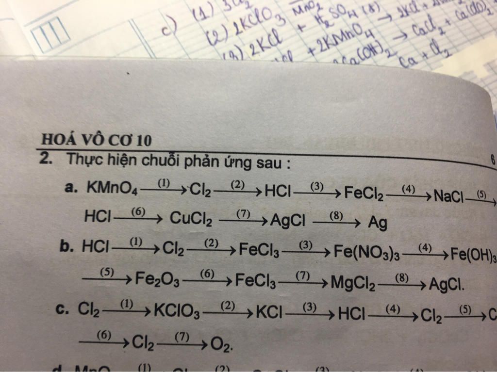 \(3C{l_2} + 6KOH\xrightarrow{{{t^o}}}5KCl + KCl{O_3} + 3{H_2}O\)