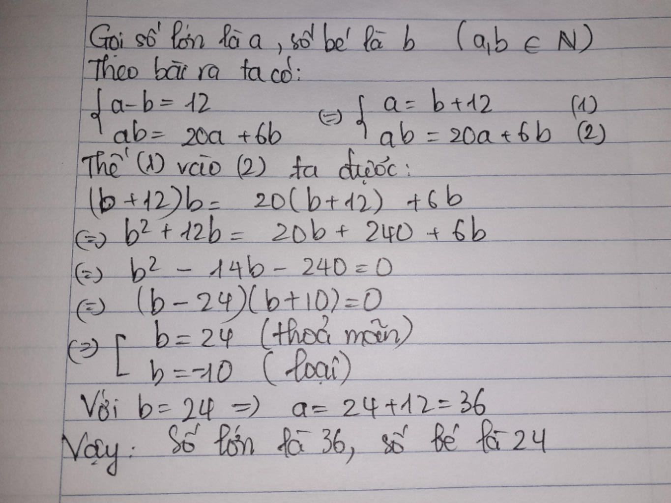 $\quad \begin{cases}a-b=12\\ab=20a+6b\end{cases}$ $⇔\begin{cases}a=b+12\\(b+12)b=20.(b+12)+6b\end{cases}$ $⇔\begin{cases}a=b+12\\b^2-14b-240=0\end{cases}$