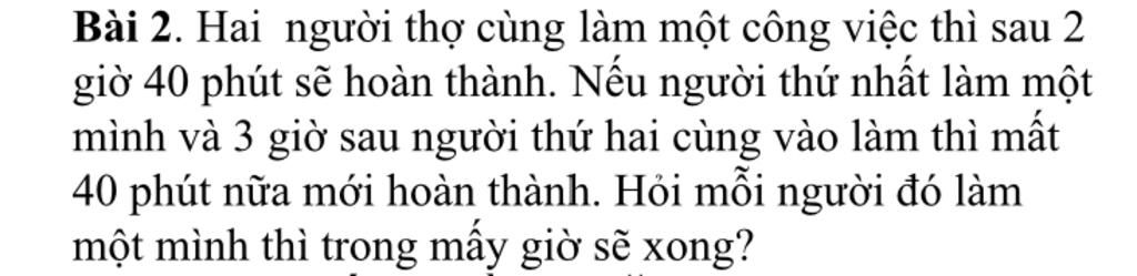 - Vì hai người thợ cùng làm công việc thì sau 2 giờ 40 phút $(2h40'=\dfrac{8}{3}h)$ sẽ hoàn thành nên ta có phương trình}: