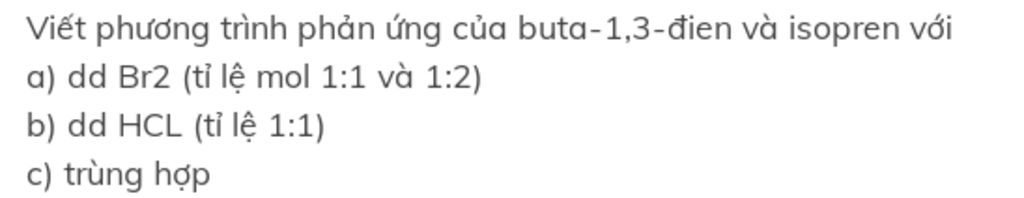 \(nC{H_2} = C(C{H_3}) - CH = C{H_2}\xrightarrow{{{t^o},xt}}{( - C{H_2} - C(C{H_3}) = CH - C{H_2} - )_n}\)