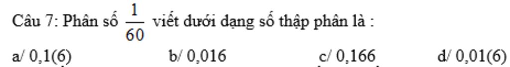 Câu 8: Kết quả của phép chia 8 :7 làm tròn đến chữ số thập phân thứ 3 bằng :