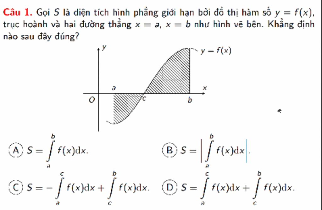 $S=\left|\displaystyle\int\limits^b_a {f(x)} \, dx\right|\\ =\left|\displaystyle\int\limits^c_a {f(x)} \, dx\right|+\left|\displaystyle\int\limits^b_c {f(x)} \, dx\right|\\ =-\displaystyle\int\limits^c_a {f(x)} \, dx+\displaystyle\int\limits^b_c {f(x)} \, dx\\ \Rightarrow C$