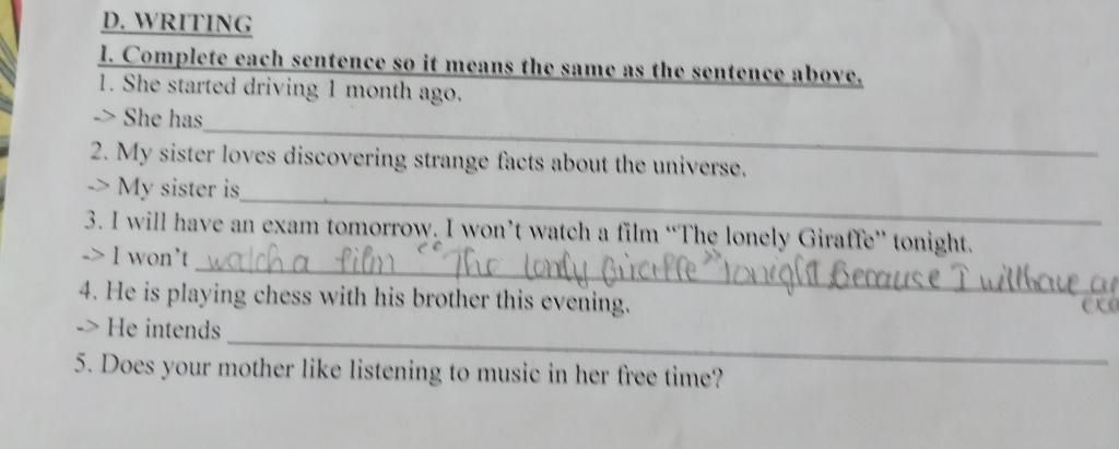 3.I won't watch a film "The lonely Girafe" tonight because I will have an exam tomorrow.