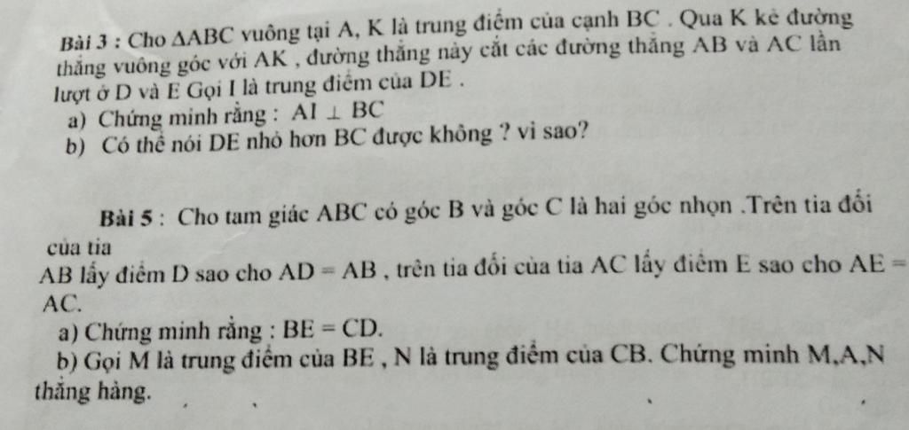 Bài 3 : Cho AABC vuông tại A, K là trung điểm của canh BC. Qua K kė đường