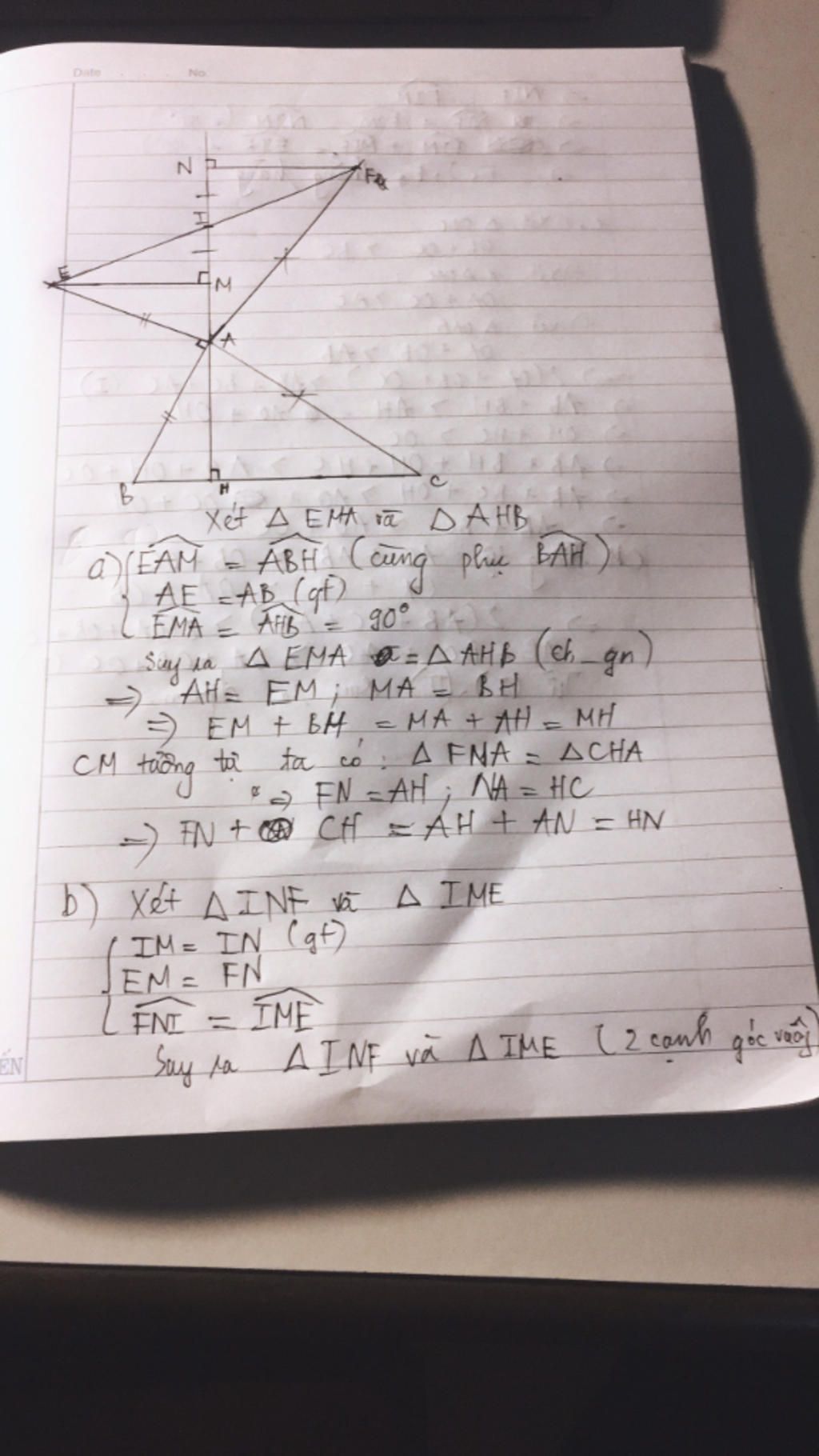 Cho `Δ ABC` nhọn , kẻ `AH ⊥ BC (H` thuộc` BC)`. Trên nửa mặt phẳng bờ `AB` không chứa điểm `C, `vẽ `AE ⊥ AB và AE = AB. `Trên nửa mặt phẳng bờ `AC` không chứa điểm` B,` vẽ `AF ⊥ AC` và `AF = AC`. Kẻ` EM` và `FN` cùng vuông góc với đường thẳng `AH (M, N` thuộc `AH).`
