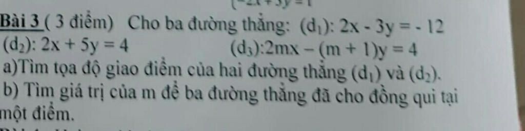 b)Để 3 đường thẳng đã cho đồng quy 1 điểm thì $A(-3;2)∈(d_3)$