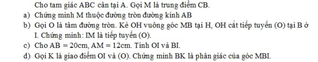 c) Cho AB = 20cm, AM = 12cm. Tính OI và BI.