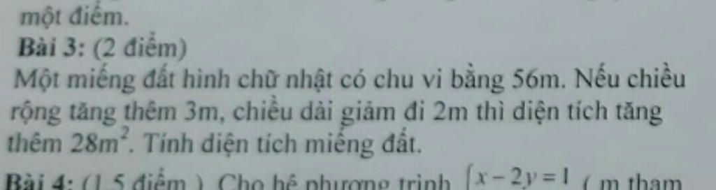 Chu vi miếng đất HCN là $2(x + y) = 56 ⇔ x + y = 28 (1)$