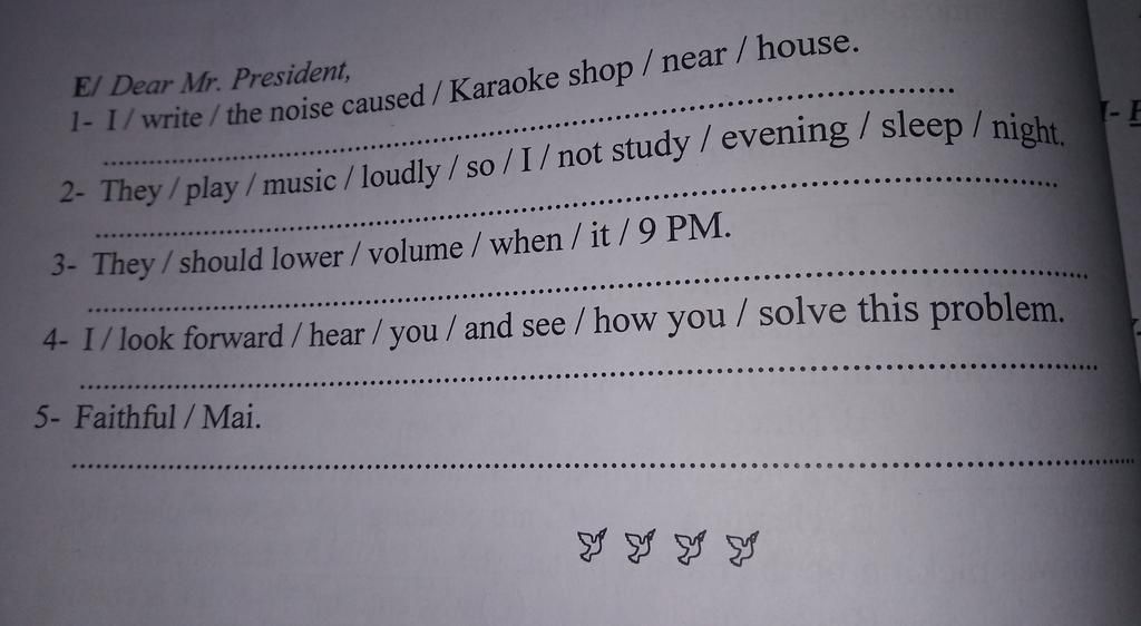 I'm writing this letter because of the noise caused by the Karaoke shop near my house. They play the music loudly so I cannot study in the evening and sleep at night. They should lower the volume when it is over 9 PM. I'm looking forward to hearing from you and seeing how you will solve this problem.
