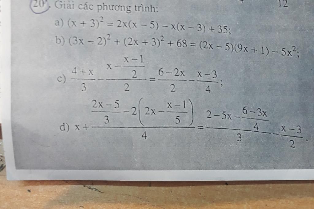 d)\dfrac{{12x + 3\left( {\dfrac{{2x - 5}}{3} - 4x + \dfrac{{2x - 2}}{5}} \right)}}{{12}} = \dfrac{{4\left( {2 - 5x - \dfrac{{6 - 3x}}{4}} \right) - 6\left( {x - 3} \right)}}{{12}}\\