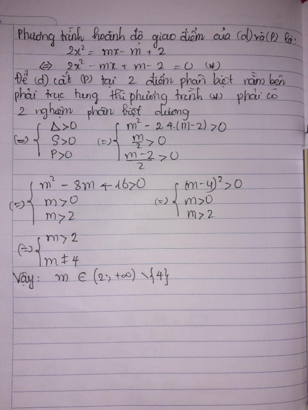 Vậy với $m>2,m \neq 4$ thì (d) cắt (P) tại 2 điểm phân biệt nằm bên phải trục tung.