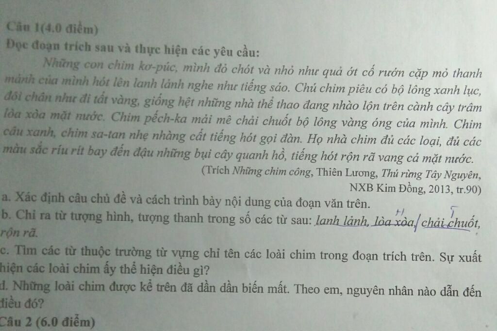 a) - Câu chủ đề : họ nhà chim đủ các loại, đủ các màu sắc ríu rít bay đến đậu những bụi cây quanh hồ, tiếng hót rộn rã vang cả mặt nước