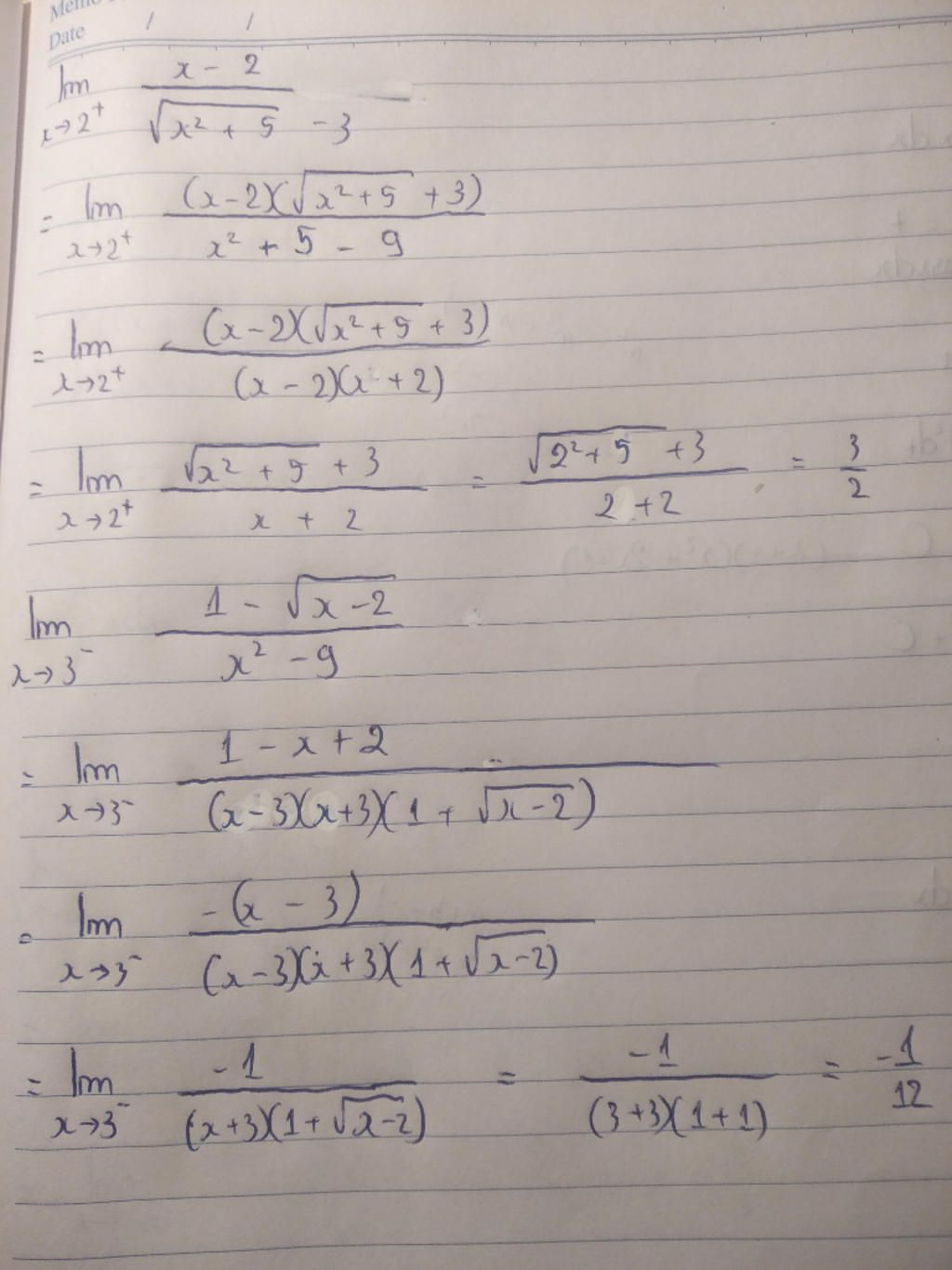 $=\lim\limits_{x\to 3^-}\dfrac{-1}{(x+3)(1+\sqrt{x-2})}$