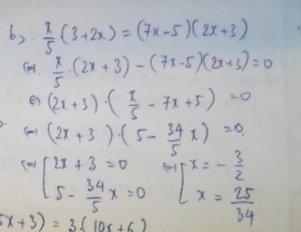 `x/5(3+2x)=(7x-5)(2x+3)`
