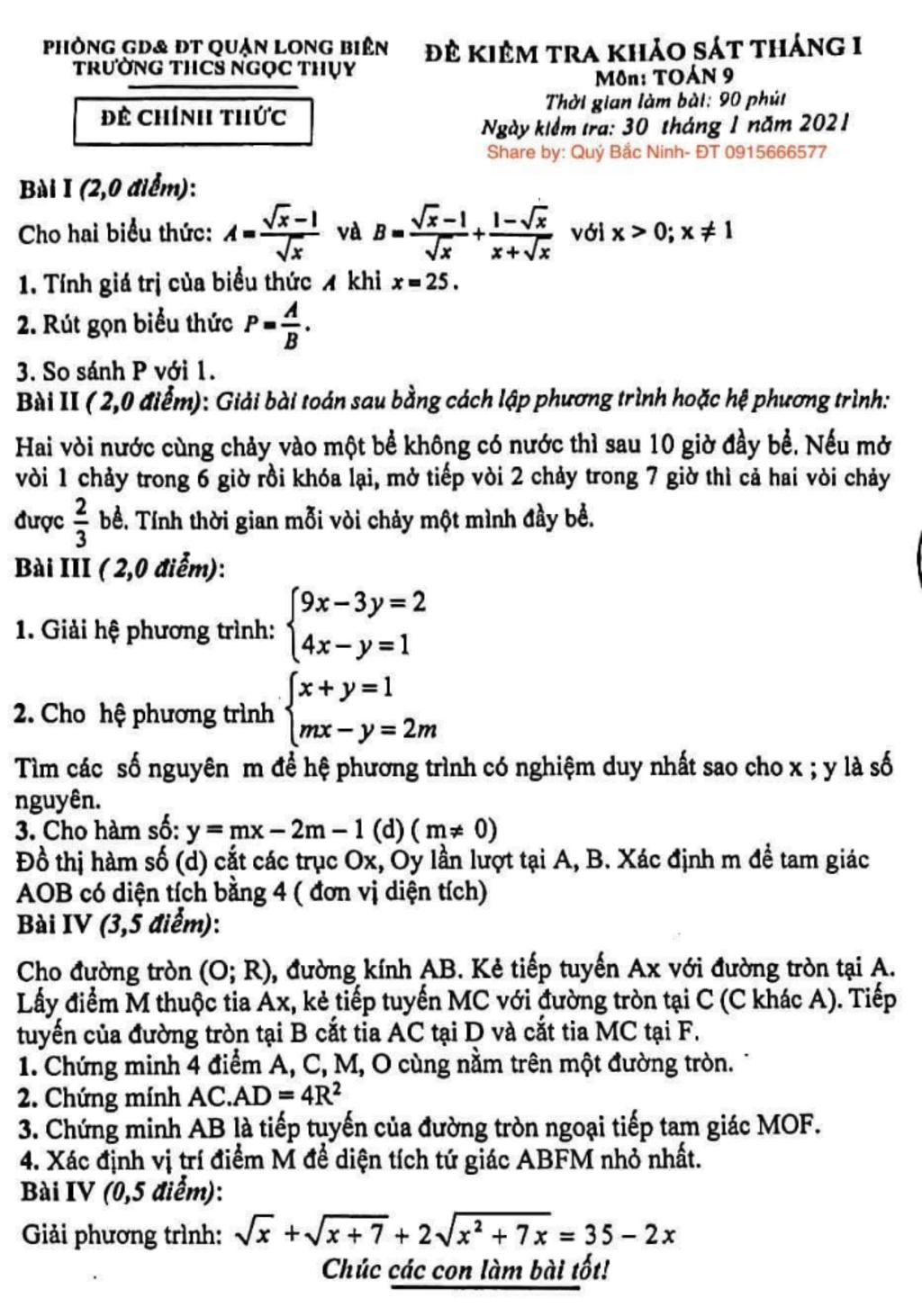 PHÒNG GD& DT QUẬN LONG BIÊN ĐỀ KIÊM TRA KHẢO SÁT THÁNG I