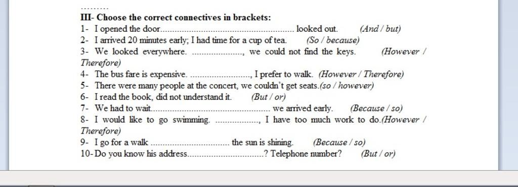 III- Choose the correct connectives in brackets: