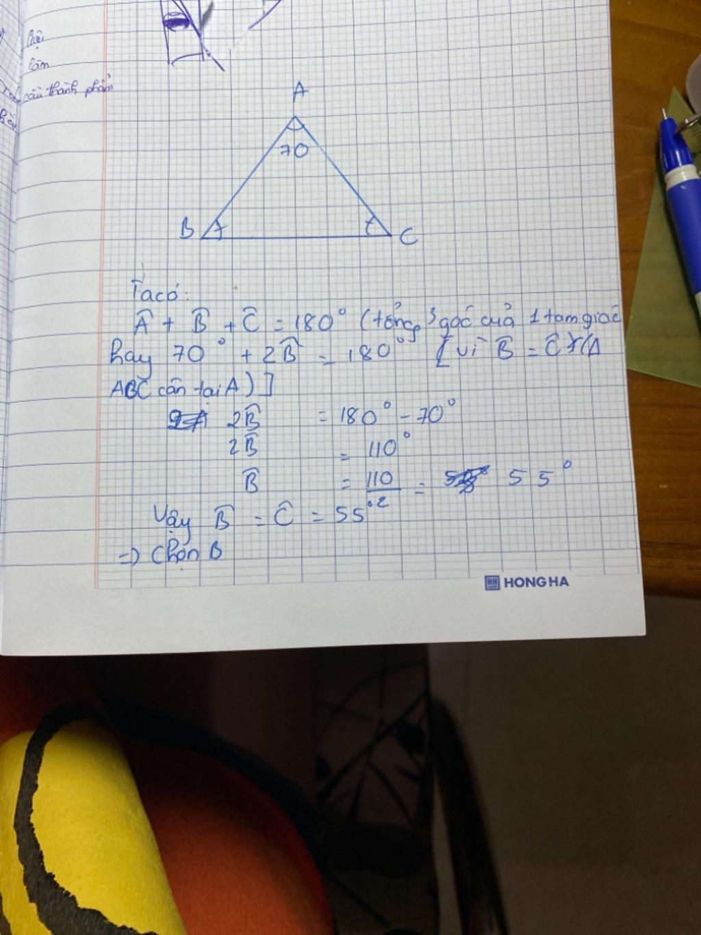 Vì là tam giác cân `=>` mỗi góc ở đỉnh bằng `110^o/2=55^o`