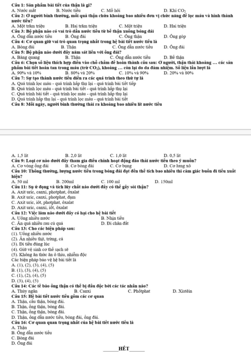 Câu 8: Mỗi ngày, người bình thường thải ra khoảng bao nhiêu lít nước tiểu:
