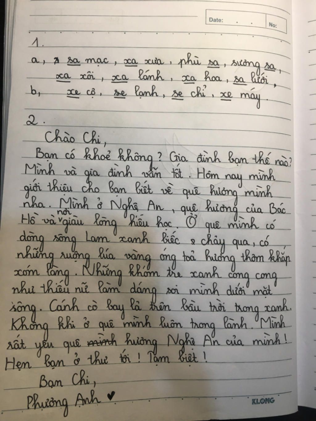 Dạo này bạn có khỏe không ? Gia đình bạn thế nào ? Còn mình và gia đình mình vẫn tốt . Lần trước , bạn đã viết thư giới thiệu về quê hương Nghệ An của bạn . Bức thư này mình sẽ giới thiệu về quê hương thân yêu của mình nhé ! Mình ở Bắc Ninh , vùng quê nổi tiếng về quan họ . Làn điệu dân ca đã đi sâu trong tâm thức bao nhiêu con đất Việt . Ở quê mình có rất nhiều lễ hội , như : Hội Lim , Lễ hội đền Đô , ... Và còn nhiều thứ khác nữa . Hẹn bạn ghé thăm quê mình .