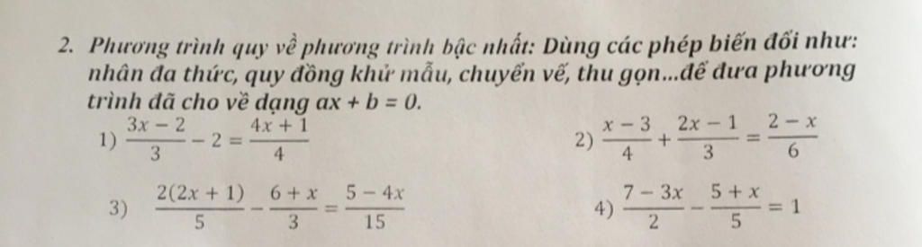 `1)` `(3x-2)/3-2=(4x+1)/4`
