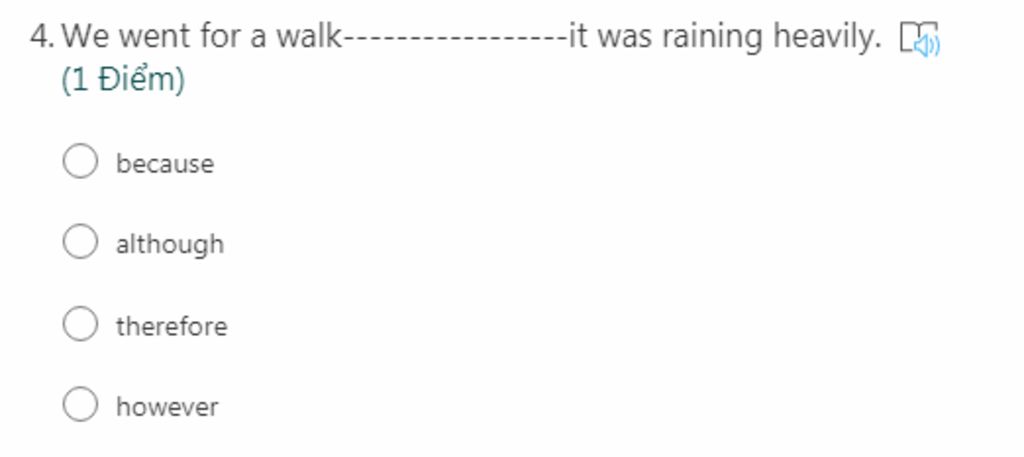 We went for a walk ___although______ it was raining heavily:Chúng tôi đi bộ mặc dù trời đang mưa rất to