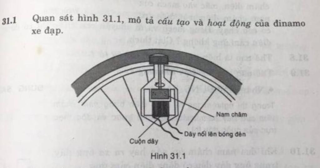 Đinamô ở xe đạp có cấu tạo gồm một cuộn dây có lõi sắt non và một nam châm có trục gắn với núm quay.