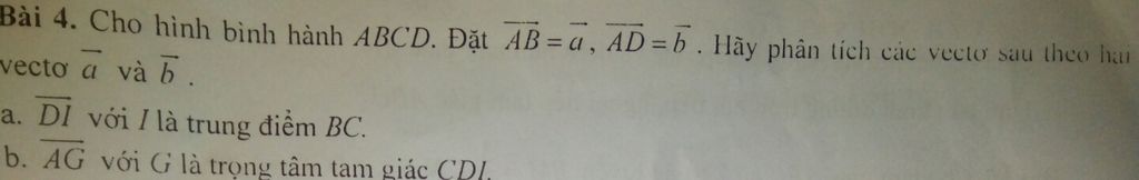 \overrightarrow {DG} = \dfrac{2}{3}\overrightarrow {DE} = \dfrac{2}{3}.\dfrac{1}{2}\left( {\overrightarrow {DI} + \overrightarrow {DC} } \right)\\