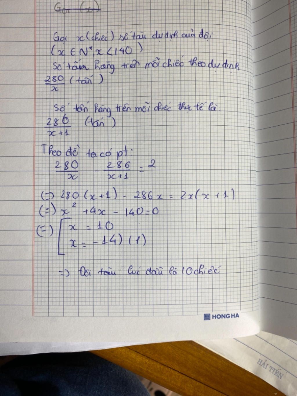 Gọi x (chiếc) là số tàu dự định của đội `(x∈N,0<x<140)`