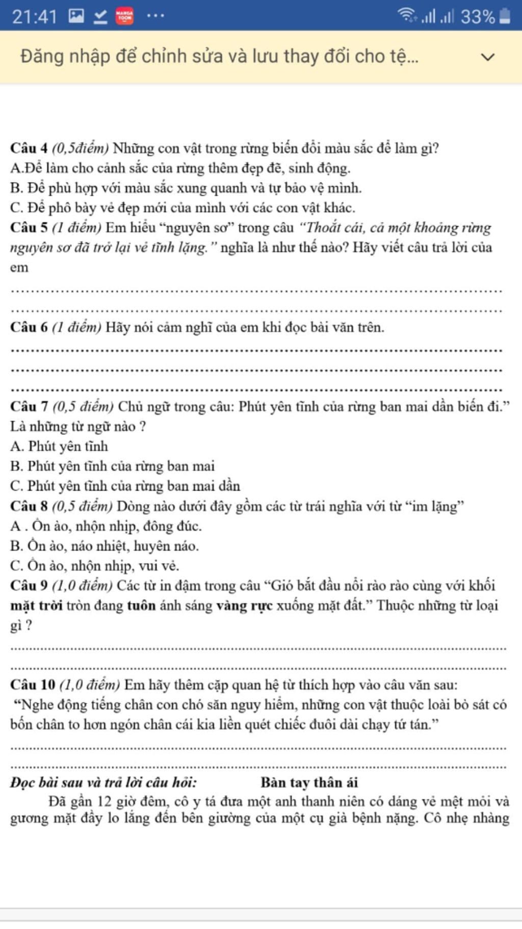 Câu 4 (0,5điểm) Những con vật trong rừng biến đổi màu sắc để làm gì?