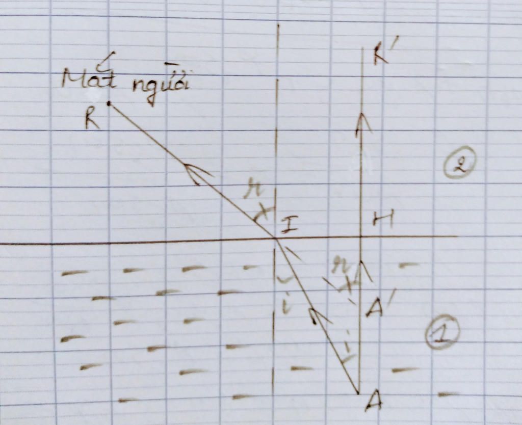 Gọi vị trí thực của bàn chân là A, vị trí bàn chân mà người đó thấy (A') là giao điểm của 2 tia ló IR và IR'