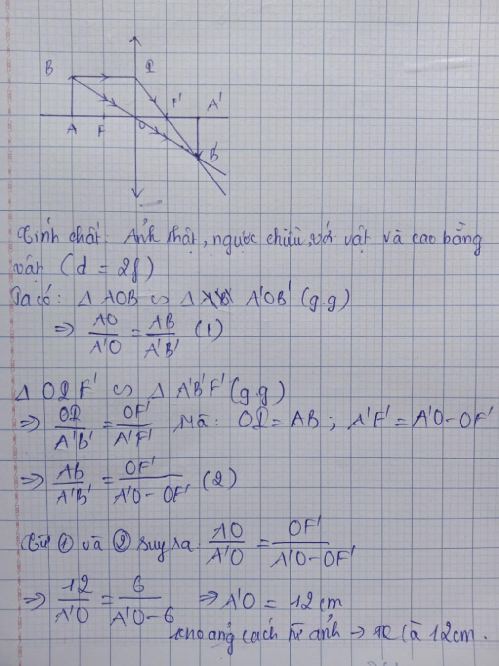 Bài 1: Một vật sáng AB đặt vuông góc với trục chính của một thấu kính hội tụ có tiêu cự 6cm. Điểm A nằm trên trục chính và cách quang tâm O một đoạn 12cm.