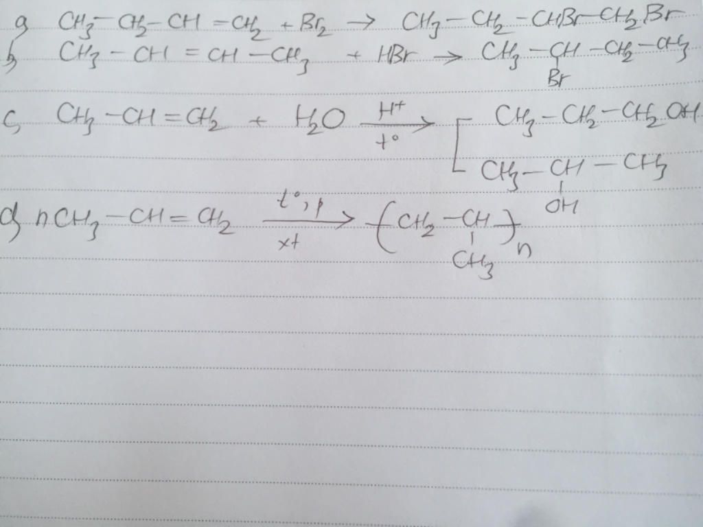 \(C{H_3} - CH = C{H_2} + {H_2}O\xrightarrow{{{H^ + }}}C{H_3} - CHOH - C{H_3}\)