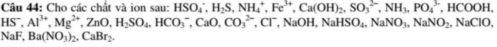 Các ion và các chất là axit: HSO4- ; H2S; NH4+; Fe3+; HCOOH; Al3+; Mg2+; H2SO4; NaHSO4