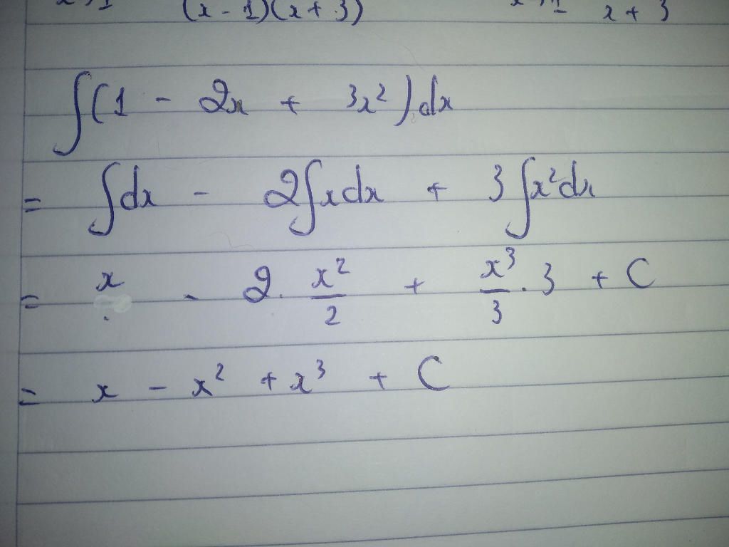 Nguyên hàm của hàm số `f(x)= 1-2x+3x^2` là `F(x)=x−x^2+x^3+C`
