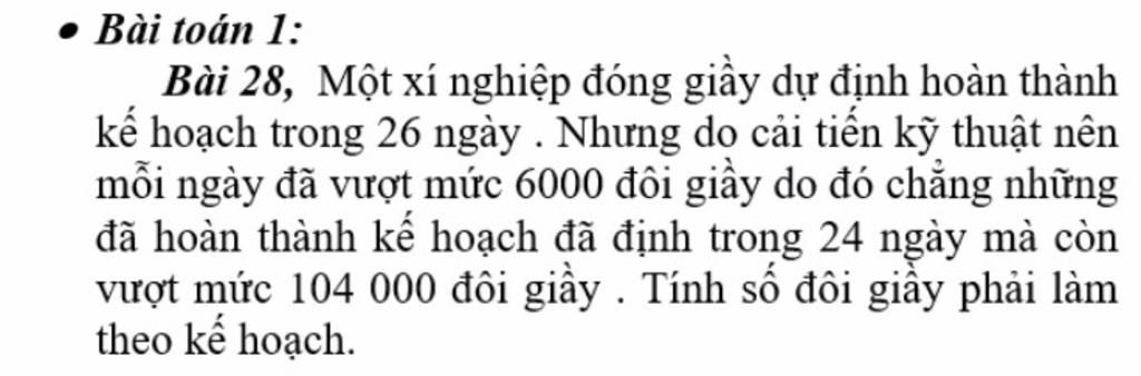 Vì thực tế xí nghiệp vượt mức dự định 104000 đôi giầy nên ta có pt: 24(x+6000)-26x=104000