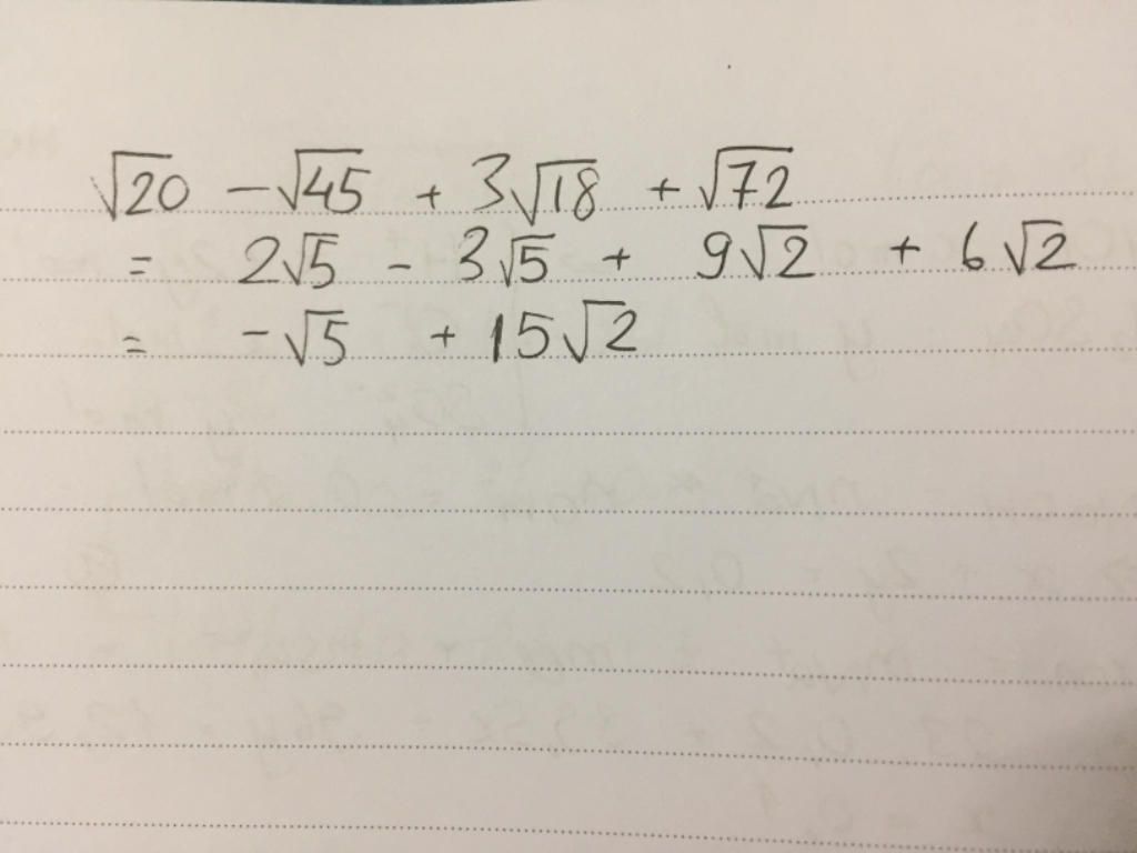 Giải thích các bước giải: \(\begin{array}{l}\sqrt {20} \, - \sqrt {45} + 3\sqrt {18} + \sqrt {72} \\ = \sqrt {4.5} - \sqrt {9.5} + 3\sqrt {9.2} + \sqrt {36.2} \\ = 2\sqrt 5 - 3\sqrt 5 + 3.3\sqrt 2 + 6\sqrt 2 \\ = - \sqrt 5 + 15\sqrt 2 \end{array}\)