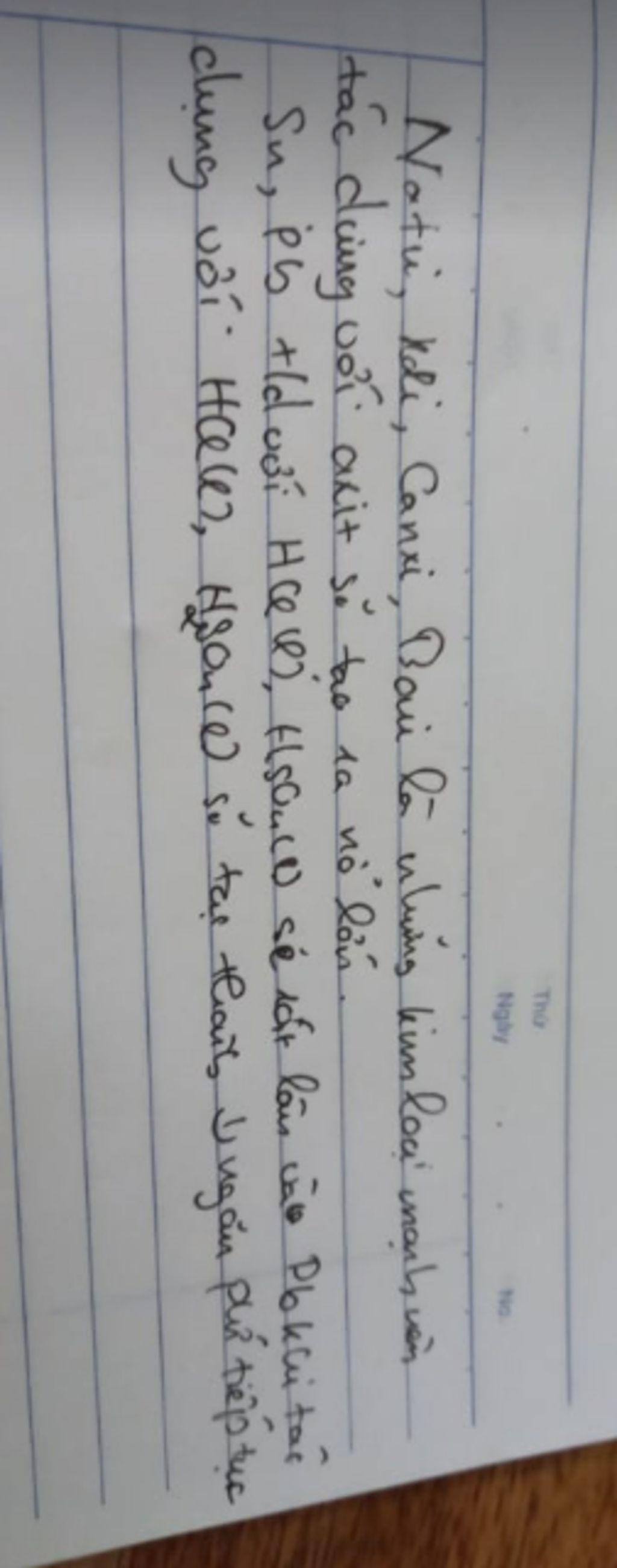 Còn pb không phản ứng với axit hcl hoặc h2so4 loãng do do các muối chì không tan bọc bên ngoài kim loại.