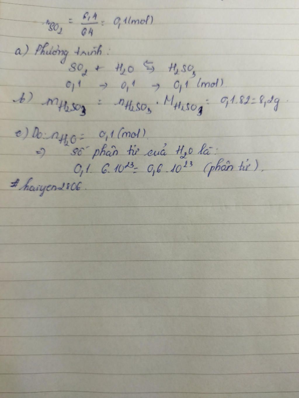 c) Số phân tử của H2O là : S= 0,1 × 6.10²³ = 6.10²²(phân tử)