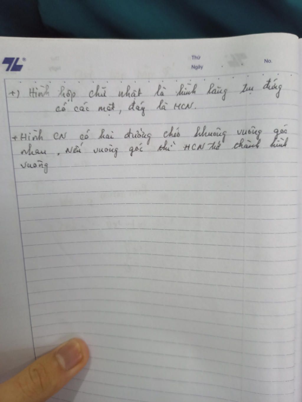 Hình chữ nhật có hai đường chéo không vuông góc nhau. Nếu vuông góc thì hình chữ nhật trở thành hình vuông.