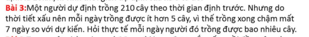 Do mỗi ngày trồng ít hơn `5` cây và thời gian chậm mất `7` ngày nên: